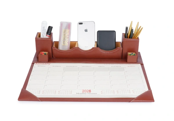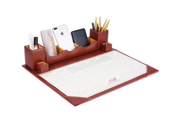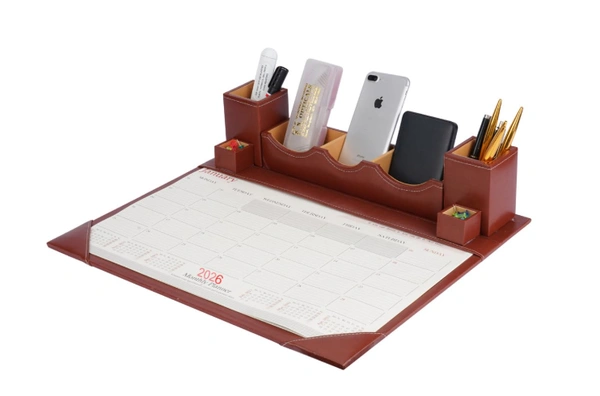 Desk calendar 2026 January to December 2026 Faux Leather Brown Paper/Memo/Phone/Card Holder Desk Table Organizer Office Supply Stationery with Planner Pack of 1